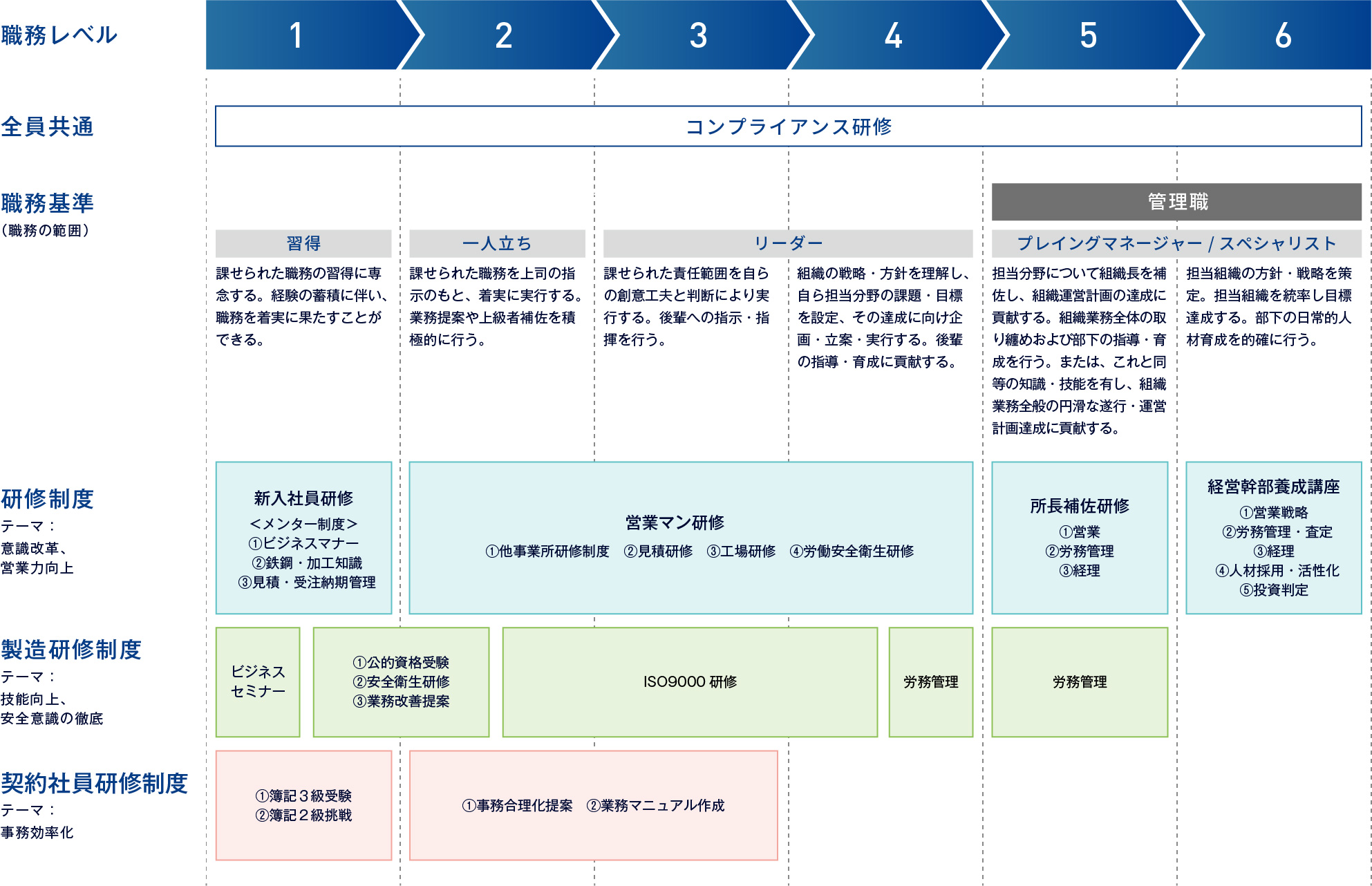 営業マン研修では鉄鋼商材の知識を基礎から段階的に習得し、提案力・コミュニケーション力のある営業マンを育成いたします。ロールプレイや先輩同行で実践力を高め、現場で求められる判断力、営業術を身につけます。成果につながる営業プロセスを段階的に定着させる充実した研修です。